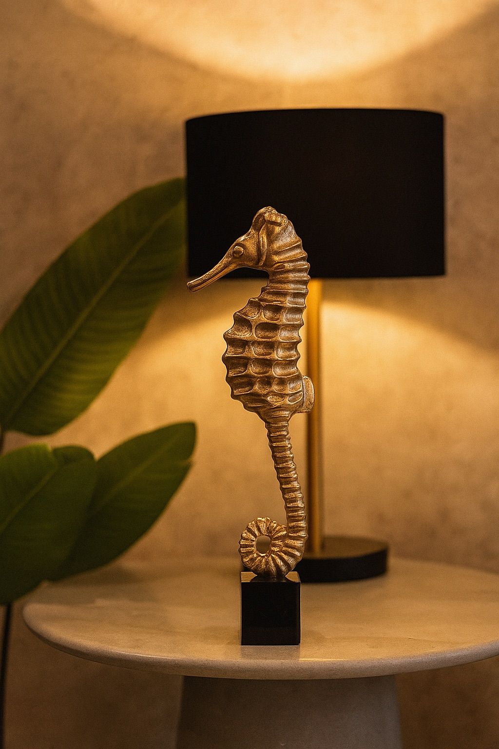 Skulpturen, som reser sig på en vit marmorbas, erbjuder en ädel framtoning och en modern, lyxig estetik. Denna guldfärgade sjöhästfigur kan visas i vardagsrummet, kontoret eller hallen och tillför energi och prestige till ditt utrymme.