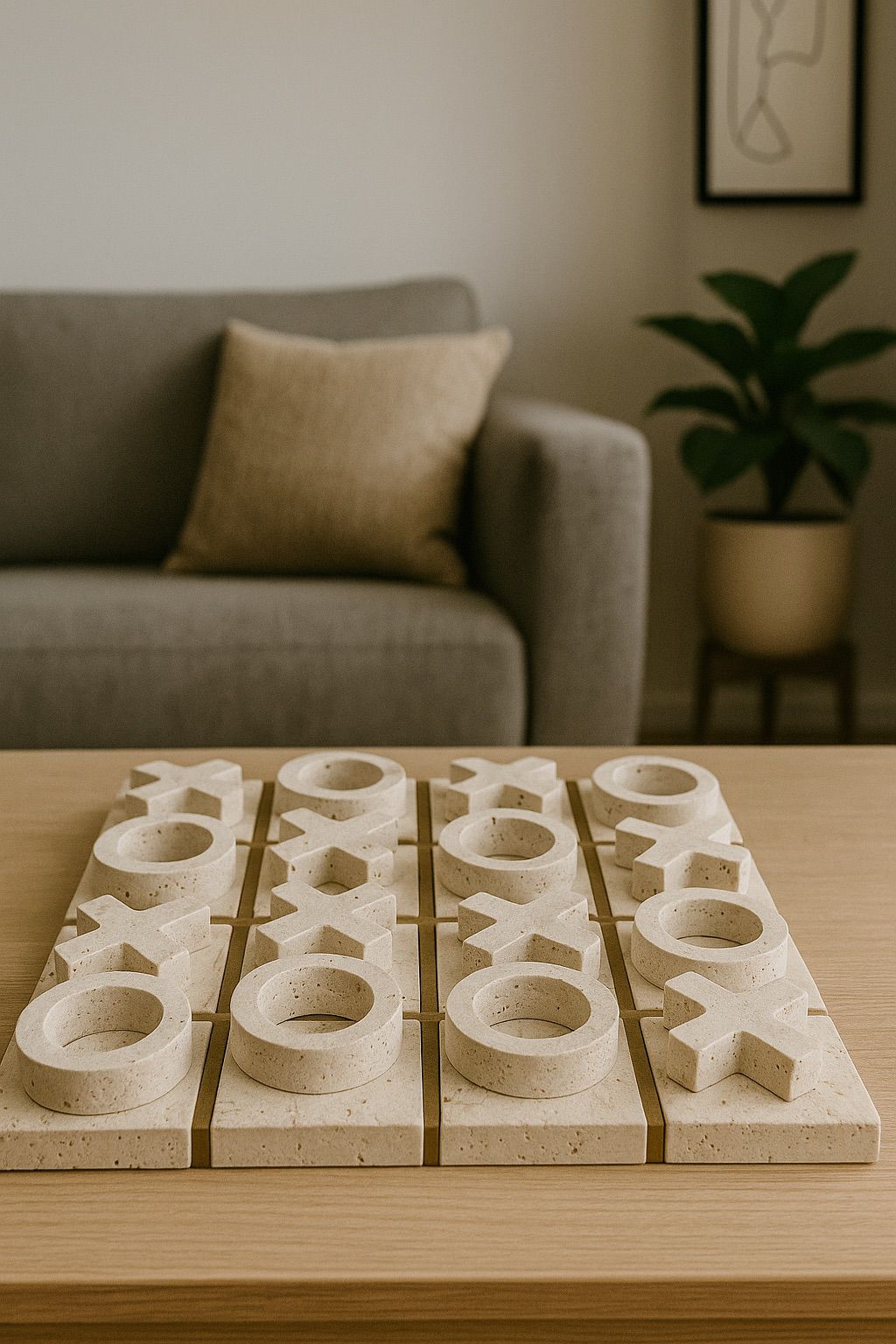 Möt Dekorativt Föremål med XOX Motiv i Travertin Look, designad för att tillföra naturlig textur, konstnärlig ordning och unik elegans till ditt utrymme. Detta föremål, som återspeglar den naturliga stenstrukturen i beige/gräddvita toner, består av en konstnärlig arrangemang av abstrakta figurer i form av "X" (Kryss) och "O" (Cirkel) som är placerade på kvadratiska baser. Denna design skapar en iögonfallande och ovanlig accent för dem som älskar modern konst och ordnade former.