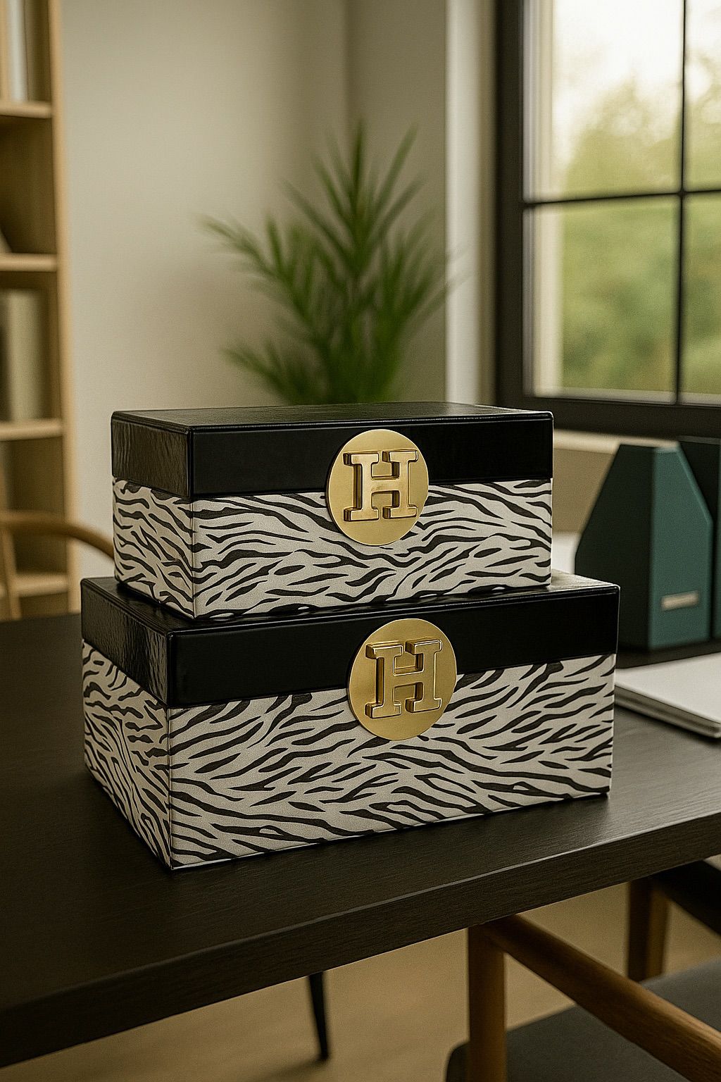 Nyckelord: dekorationslåda, lyxig låda, zebramönster, H-Modell, djurmönstrad inredning, svart vit inredning, gulddetalj, förvaringslåda, 2-pack lådor, elegant hemtillbehör.