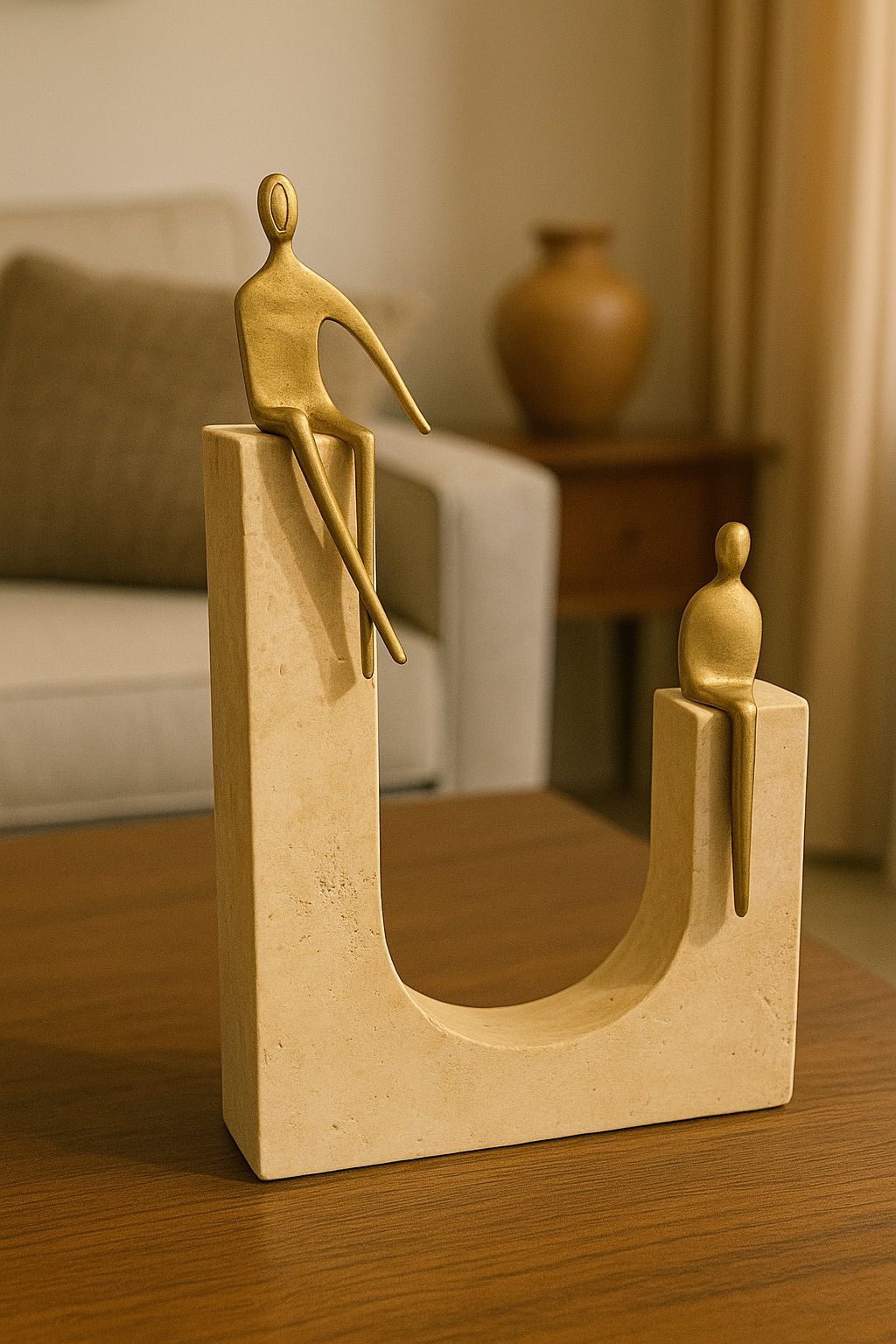 Möt Dekorativt Föremål med Sittande Figur på Travertinbas, designat för att tillföra lugn, djup och minimalistisk elegans till ditt utrymme. Den breda, L-formade basen i matt beige/gräddvit färg, som speglar den naturliga stenstrukturen, utgör föremålets fundament. På denna enkla bas sitter två glänsande guldfärgade minimalistiska mänskliga figurer i olika höjder. Dessa figurer skapar en konstnärlig komposition som symboliserar eftertanke och harmoni.