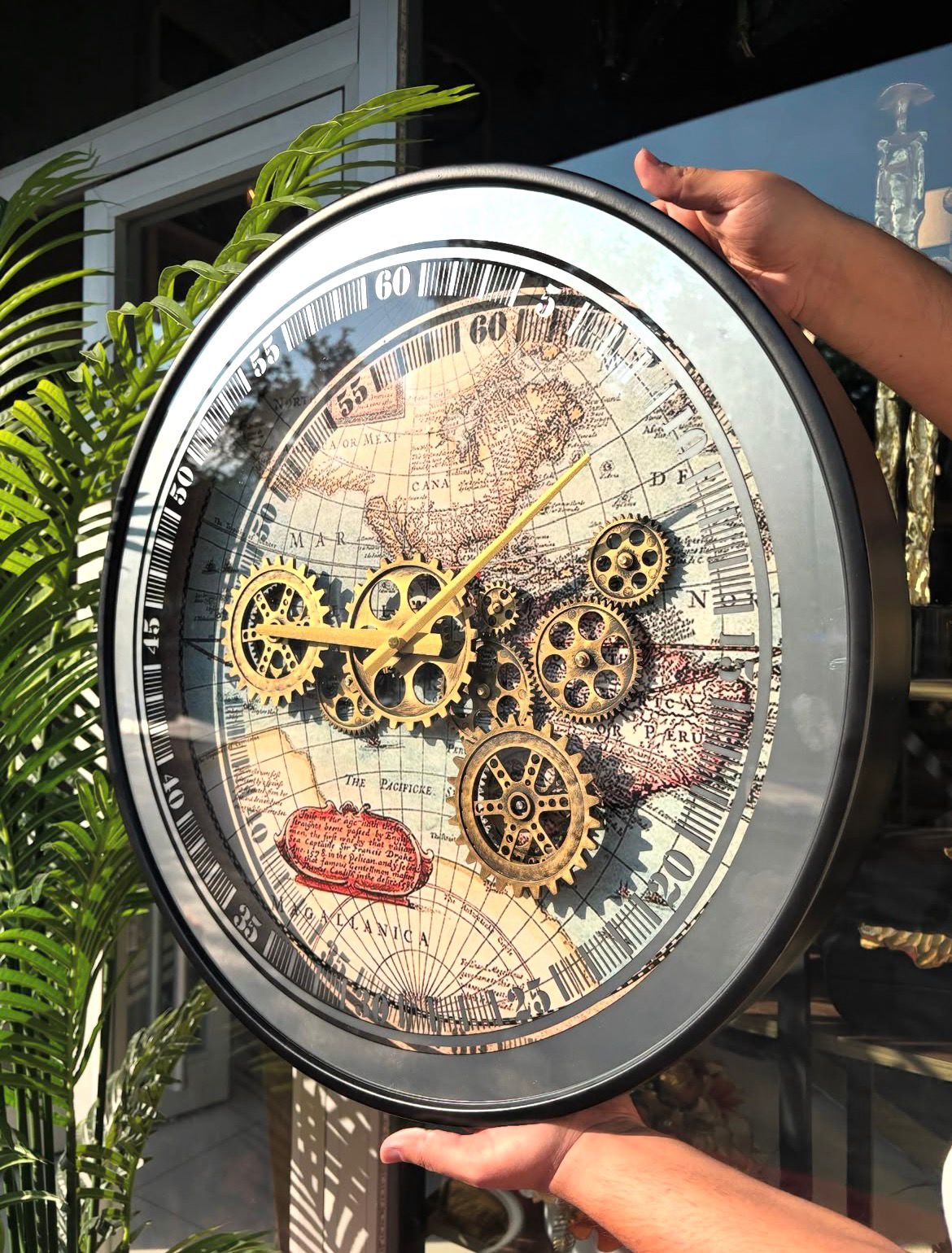 Denna lyxiga väggklocka tillför global elegans och hög reflektivitet till ditt utrymme. Klockans urtavla är dekorerad med detaljerade världskartmotiv, och i mitten är den fungerande mekanismen med kugghjul helt exponerad. Med sin reflekterande ram och glas har klockan en "Spegel" look och skapar en fokuspunkt i Industriell Lyx stil.