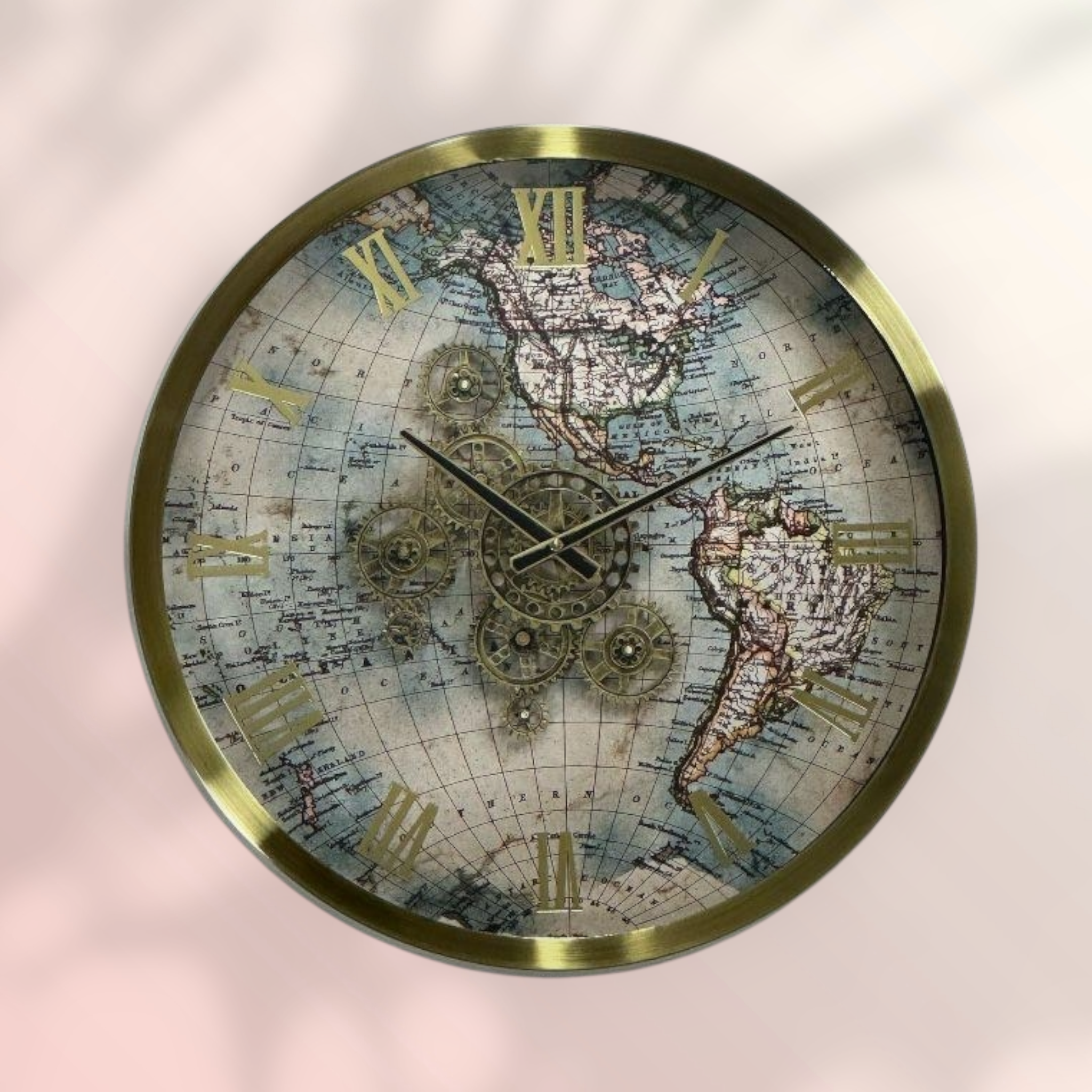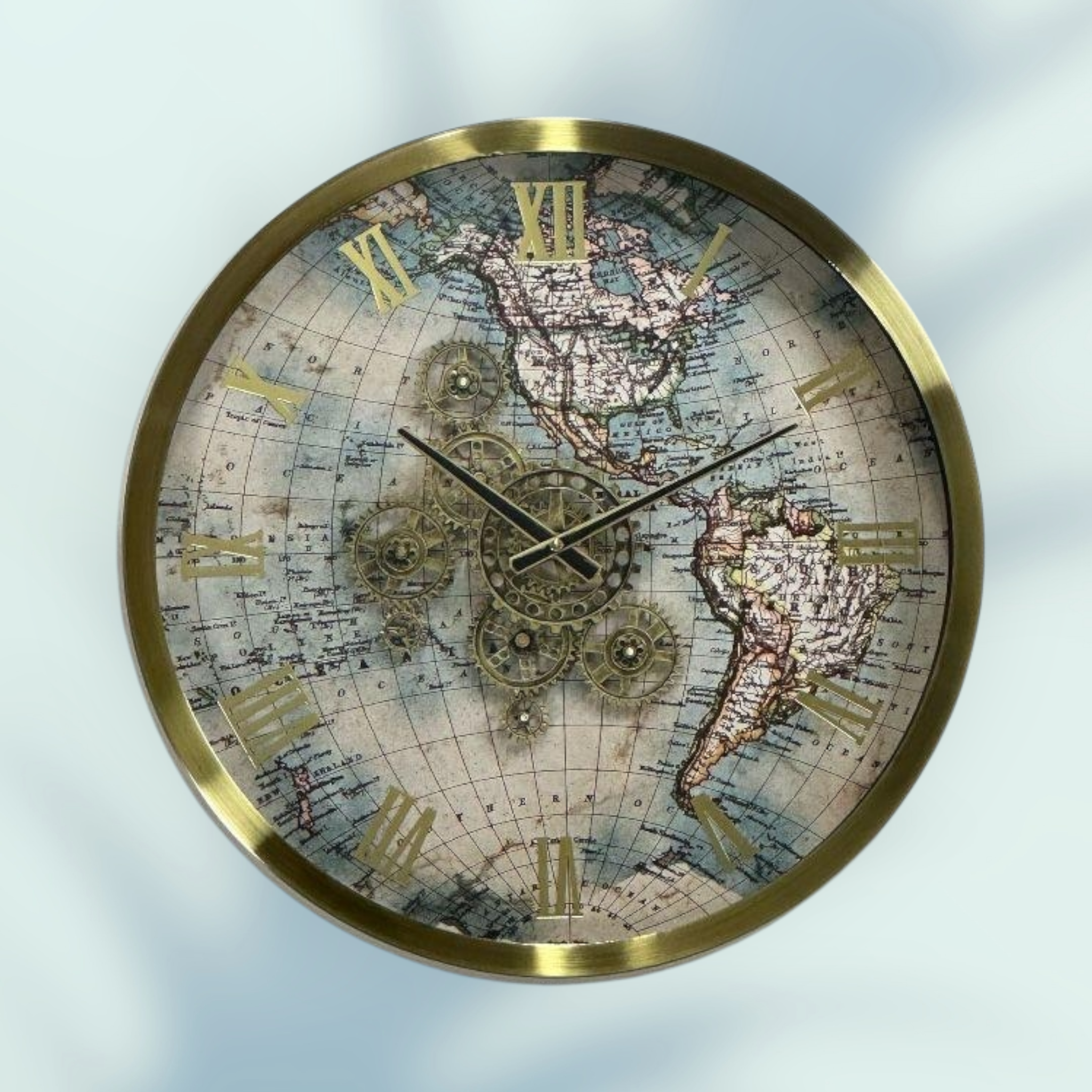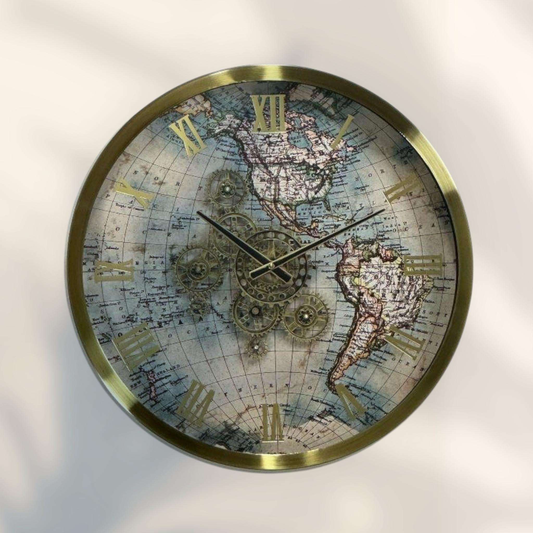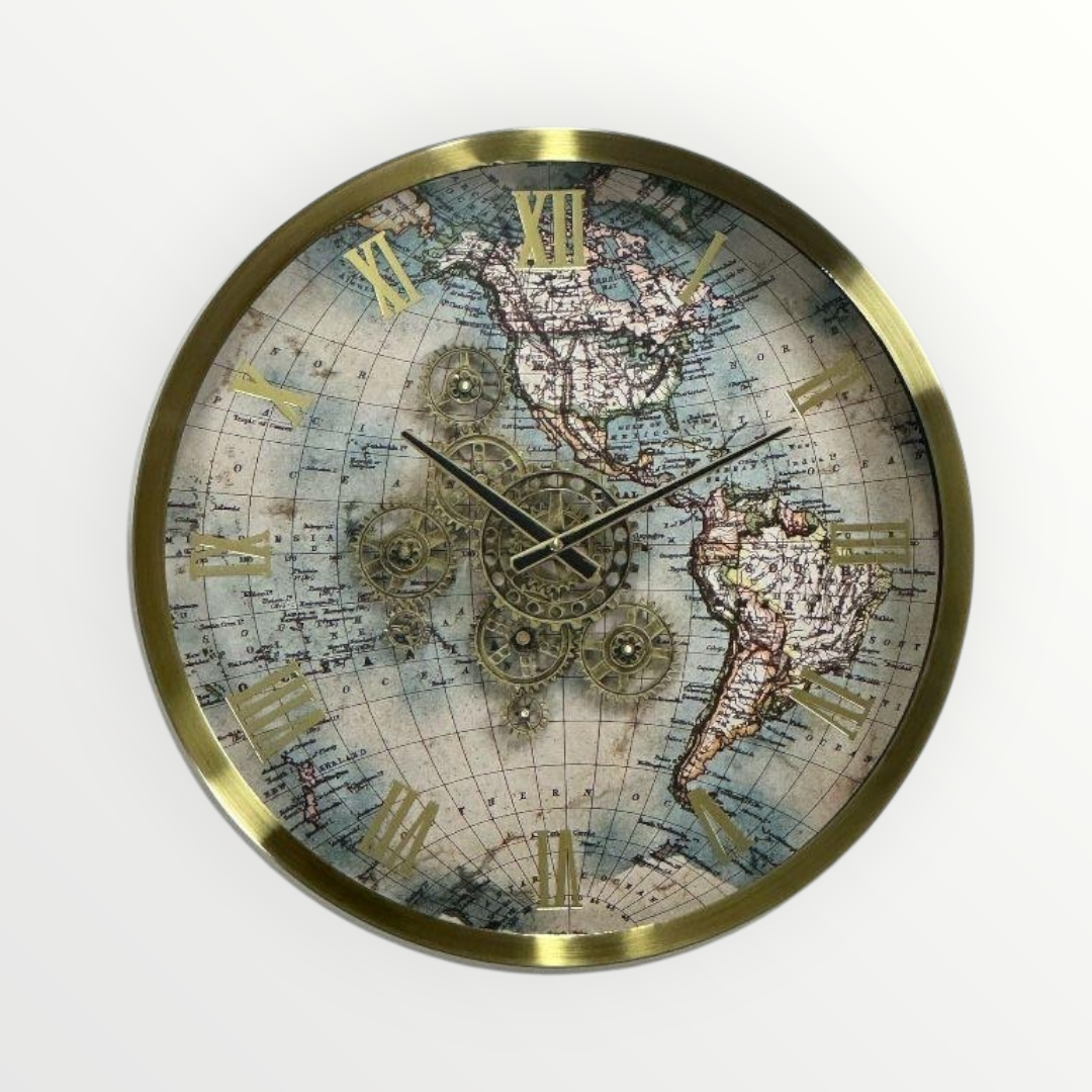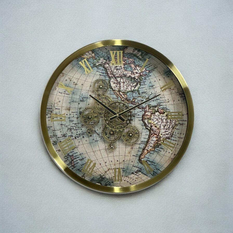 Möt Eos-6001 Väggklocka, designad för att tillföra en tidlös äventyrsanda, klassisk elegans och modern lyster till ditt utrymme. Denna stora och runda klocka har en ram av glänsande guldfärgad metall. Hela urtavlan är dekorerad med detaljerade vintage världskartmotiv.
