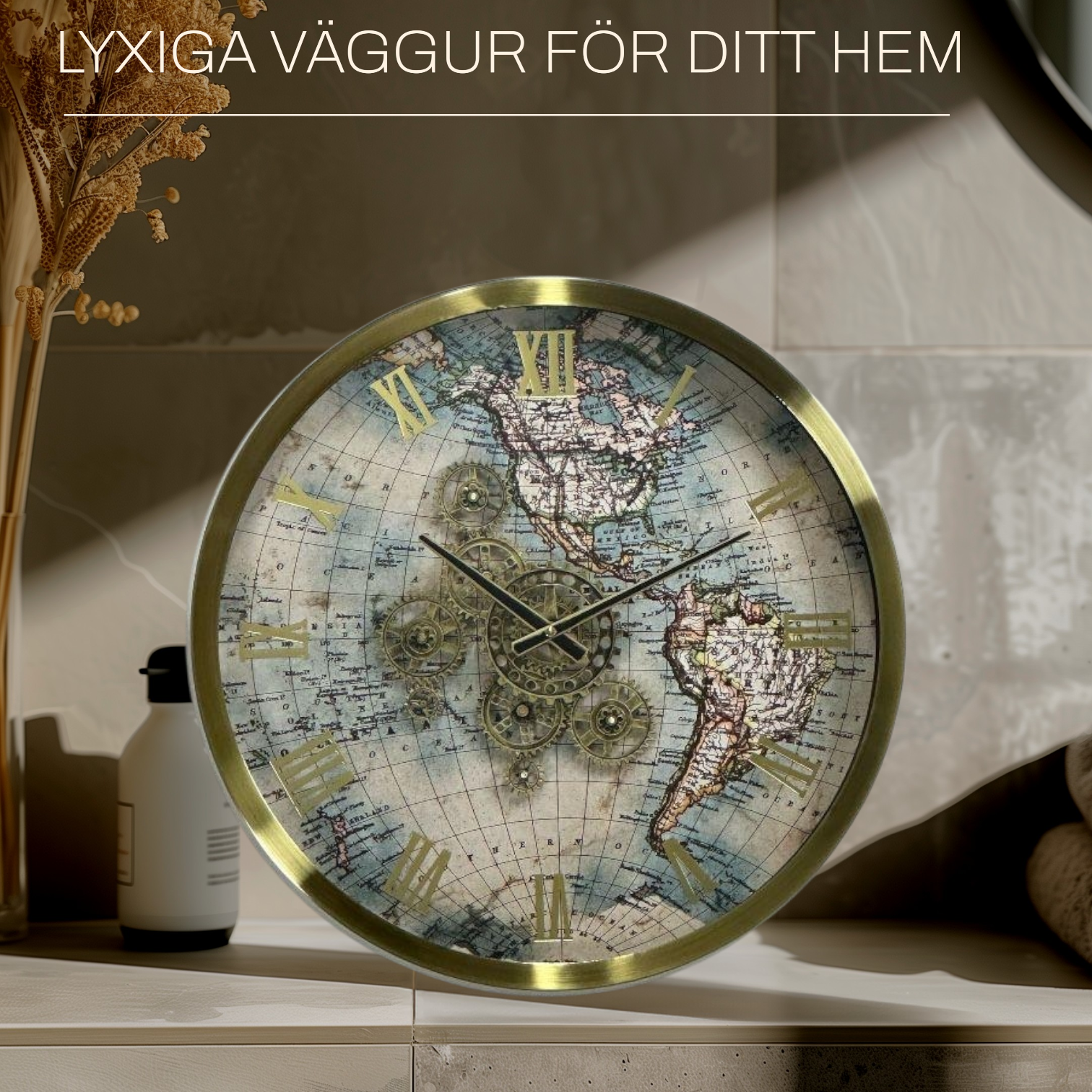 I klockans centrum finns den öppna, fungerande mekanismen med guldfärgade kugghjul. Romerska siffror omger urtavlan i samma guldfärg och förstärker klockans klassiska och sofistikerade stil. Tack vare LED-belysningen skapar klockan en varm och iögonfallande fokuspunkt på din vägg.