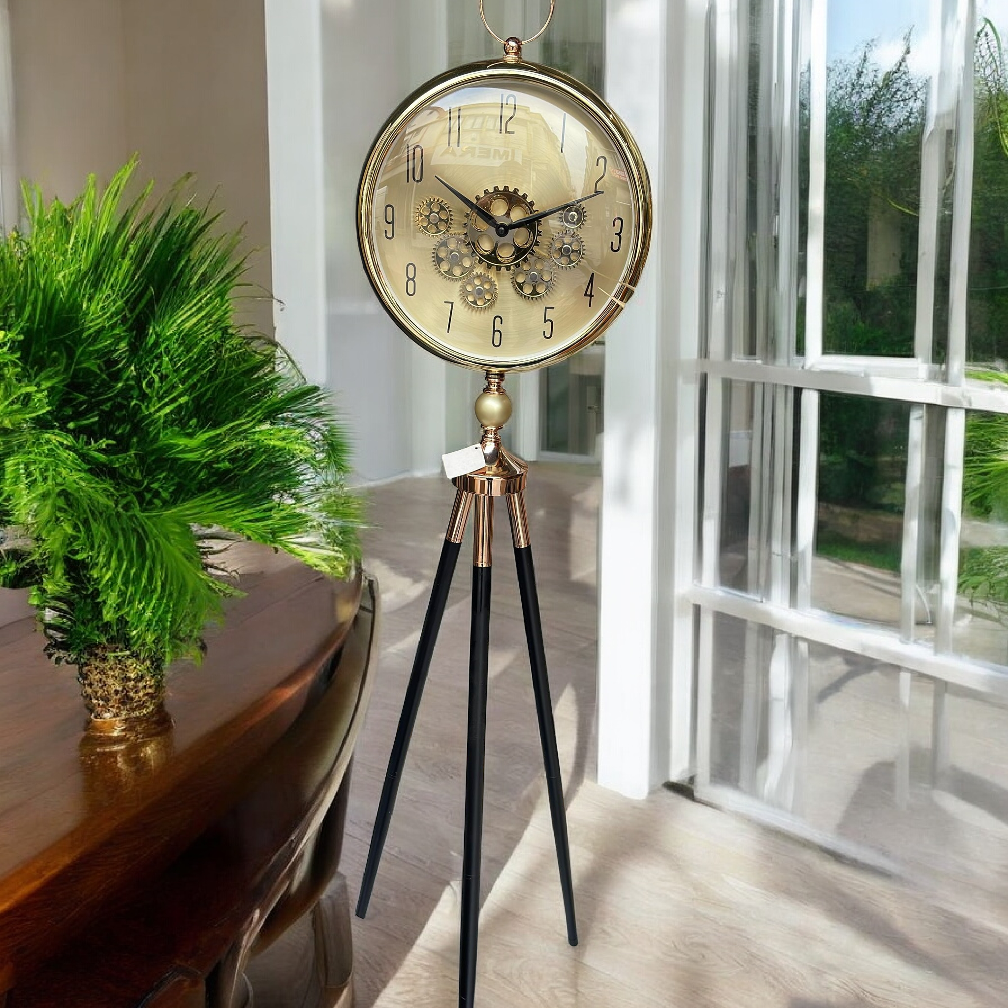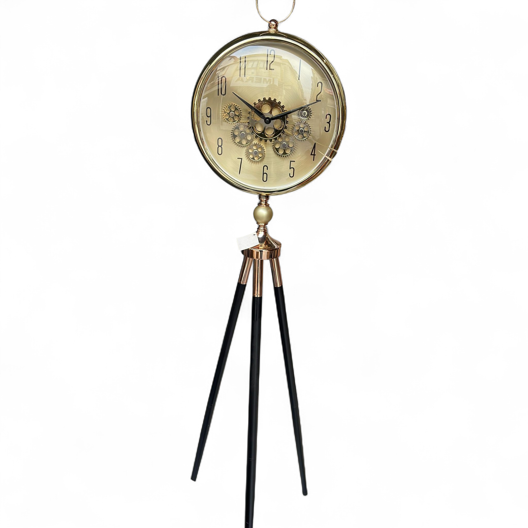 Denna Tripodklocka är en slående design som förenar den moderna elegansen hos svart med den lyxiga lystern i guldmetall. De 150 cm höga svarta träbenen ger klockan en maskulin och distinkt karaktär, medan det guldfärgade rörliga kugghjulssystemet i toppen tillför en sofistikerad dynamik. Som en perfekt mittpunkt för loft, industriell design eller moderna kontor, fungerar denna klocka både som en exklusiv tidvisare och ett konstobjekt med hög prestige.