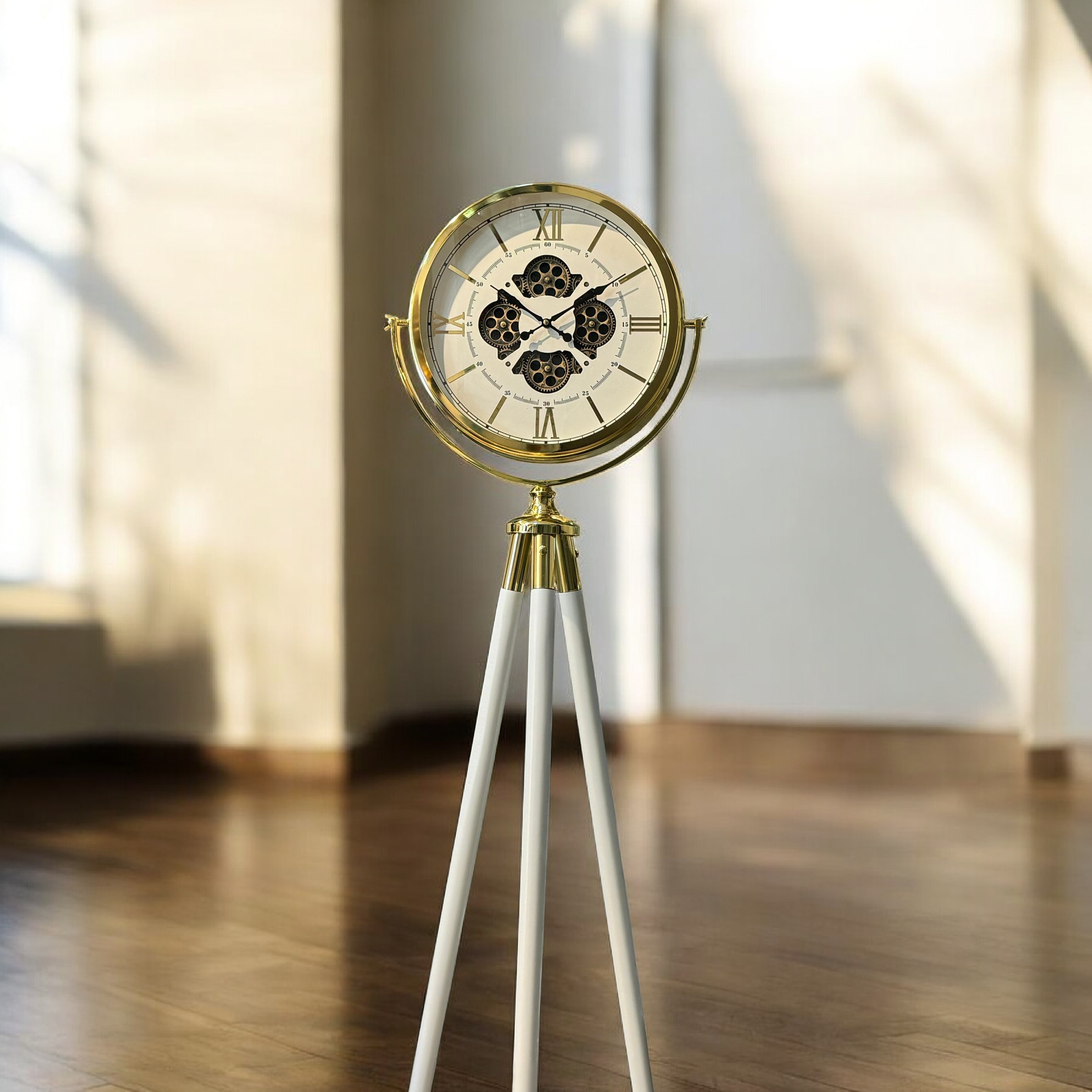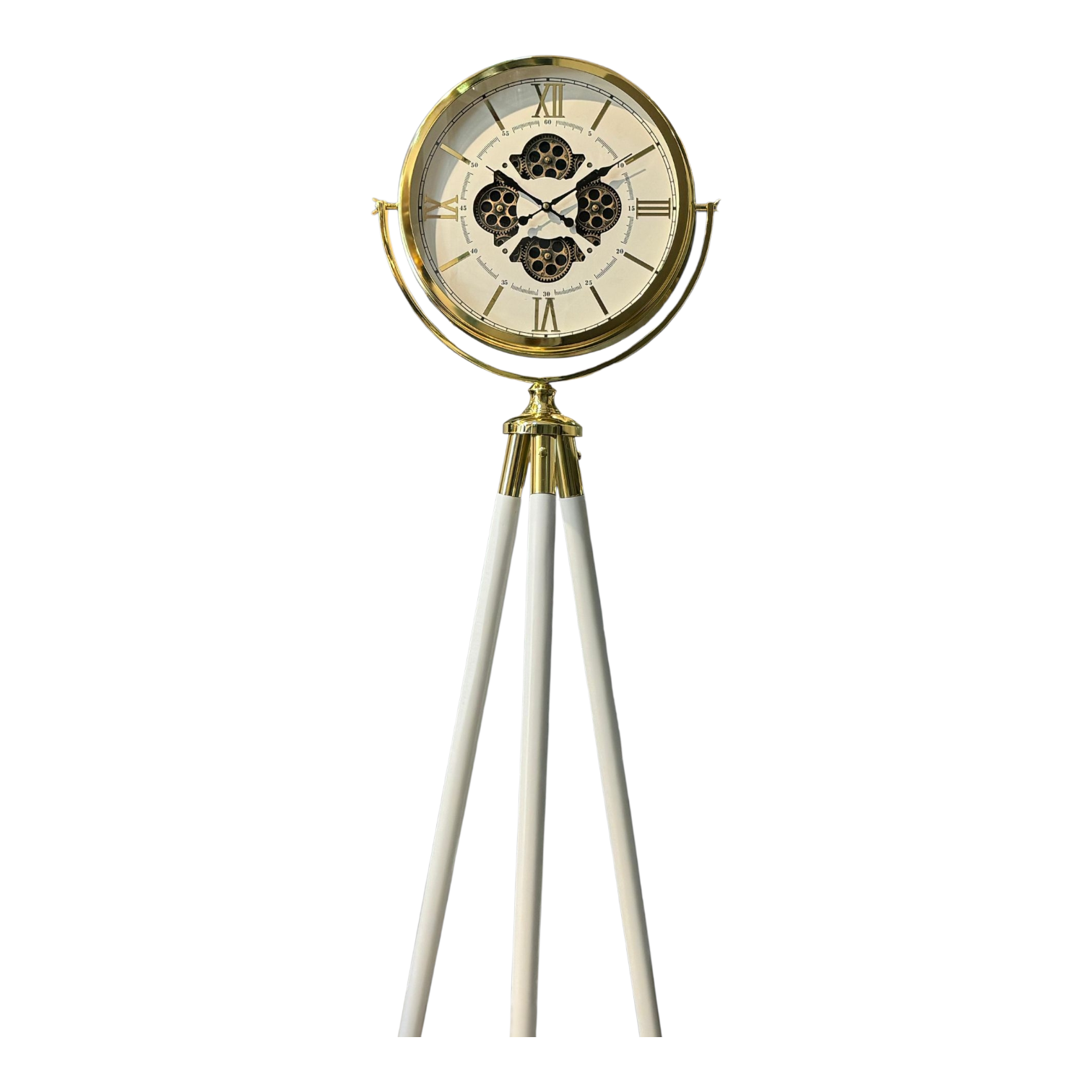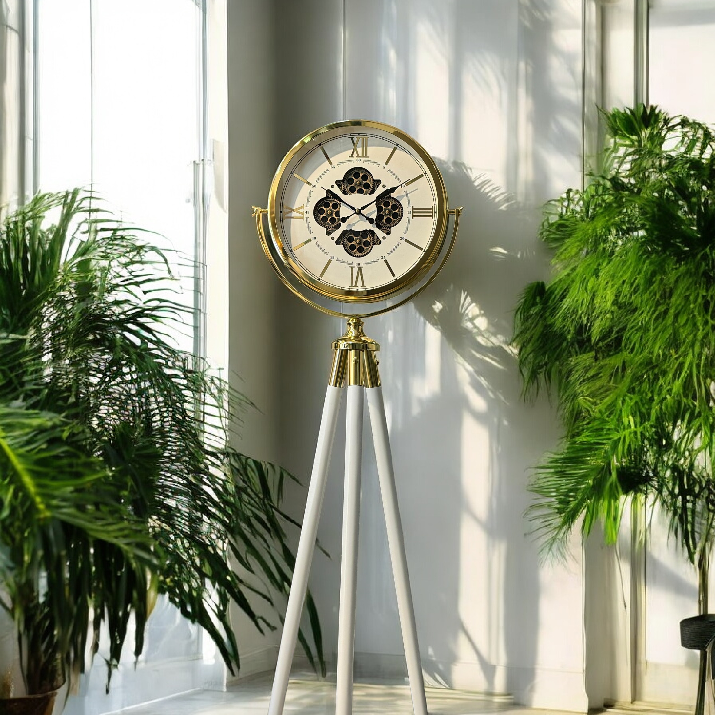 Denna Tripodklocka är en ikonisk inredningsdetalj som förenar industriell design med skandinavisk elegans. Med sin imponerande höjd på 150 cm blir klockan rummets naturliga mittpunkt, där de vita träbenens fräschör möter de lyxiga detaljerna i de guldglänsande metallhjulen. Den rörliga kugghjulsmekanismen ger klockan en dynamisk karaktär, medan tripod-konstruktionen bidrar med en modern och konstnärlig estetik. Det är det perfekta valet för att skapa en sofistikerad atmosfär i både hemmet och på det prestigefyllda kontoret.