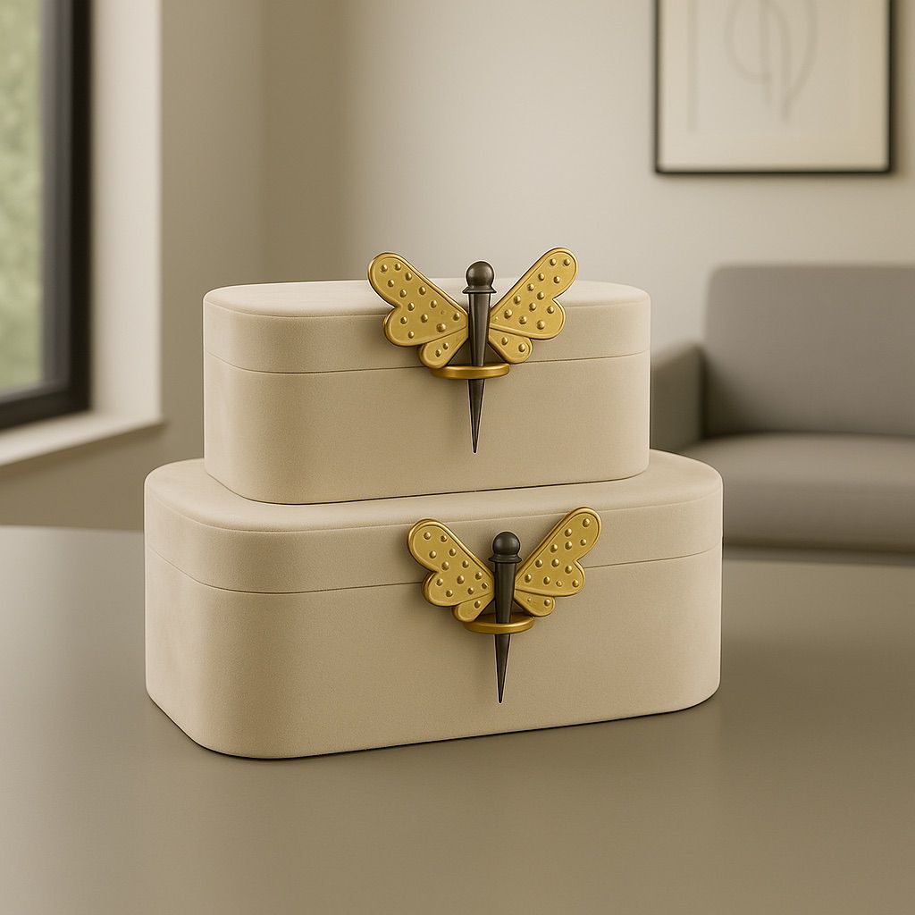 Tillför en lätt, elegant och magisk touch till din inredning med denna Lyxig Dekorativ Låda Set med Fjärilsfigur. Detta lyxiga låda set, bestående av två delar, erbjuder en romantisk och konstnärlig estetik med sin släta yta och de iögonfallande, guldtonade fjärilsfigur spännen på locket.