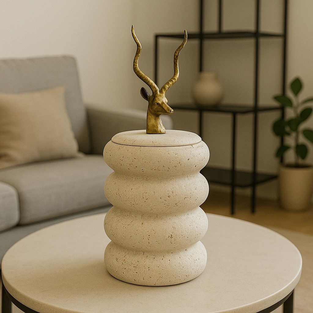 Möt Dekorativt Föremål med Hjorthuvud på Lock i Travertin Look, designad för att tillföra naturlig textur, avantgardistisk design och en känsla av etnisk lyx till ditt utrymme. Detta stora föremål i beige/gräddvita toner har en kropp som består av staplade klot-/ringformar, vilket återspeglar den naturliga stenstrukturen. Den mest slående detaljen är den eleganta hjort-/gasellhuvud-figuren med smala, långa horn i antikguld/mässings färg, placerad i mitten av locket.